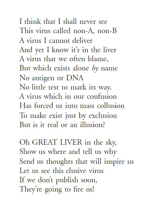 丙肝病毒的發(fā)現過(guò)程充滿(mǎn)了曲折,在第一次發(fā)現丙肝感染病例之后,科學(xué)家們花了十余年時(shí)間的努力以圖分離、辨別致病病毒而無(wú)果,只能稱(chēng)之為“非A、非B型”肝炎,逼得當時(shí)的Harvey Alter為此而創(chuàng )作了一首吐槽詩(shī):