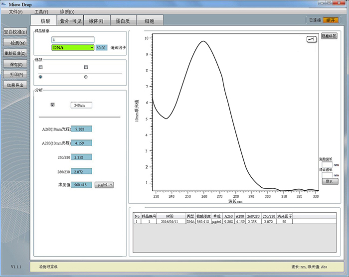 3、輸入樣品編號,選擇檢測的樣品類(lèi)型(默認的設定為DNA,消光因子為50)。用移液器滴加樣品0.5-2μlMicro Drop下部樣品基座,關(guān)閉上臂,選擇“檢測”,軟件會(huì )自動(dòng)計算出的核酸濃度和純度比例,3-5秒內,即可顯示實(shí)驗結果及光譜圖。