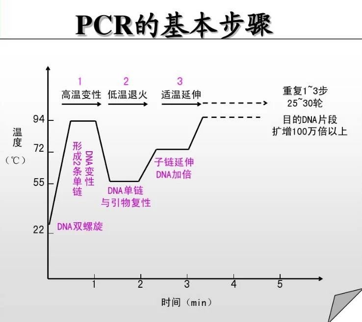PCR又稱(chēng)聚合酶鏈反應,是體外擴增目的DNA片段的方法,在多方面廣泛應用,主要分為三大步驟:高溫變性、低溫退火、適溫延伸。分別添加引物、模板、Taq酶、dNTP和緩沖液等反應物混合,在約為95℃環(huán)境下,雙鏈DNA氫鍵斷裂解旋為單鏈;單鏈與人工設計的引物在約為60℃溫度下,按照堿基互補配對的原則相結合;并升溫到72℃左右,利用Taq酶延伸合成一條新的與模板DNA鏈互補的半保留復制鏈。