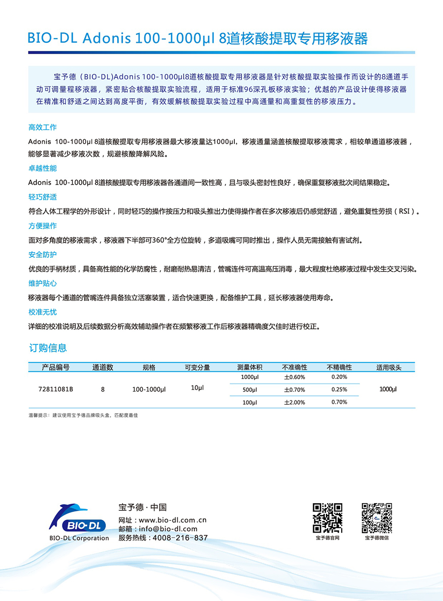 Adnios 100-1000μl 8道核酸提取專(zhuān)用移液器-BIO-DL寶予德